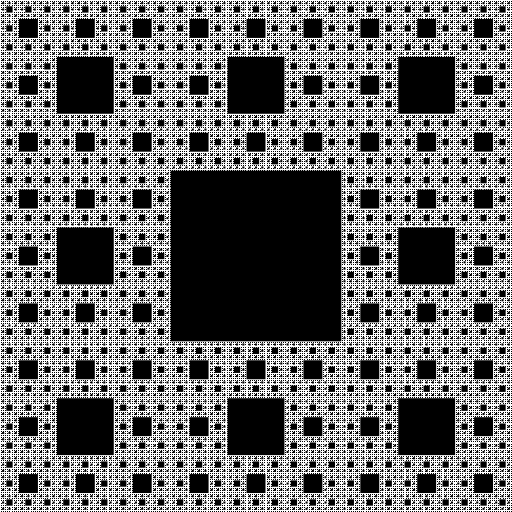 The Sierpinski carpet is an example of a fractal pattern, like the H-tree pattern from Section 2.3 of the textbook. The Polish mathematician Wacław Sierpiński described the pattern in 1916. Though the Sierpinski carpet looks complex, it can be generated with a short recursive program. Your tasks are to write a recursive program that draws the Sierpinski carpet and a second program that draws another design of your choosing using recursion.